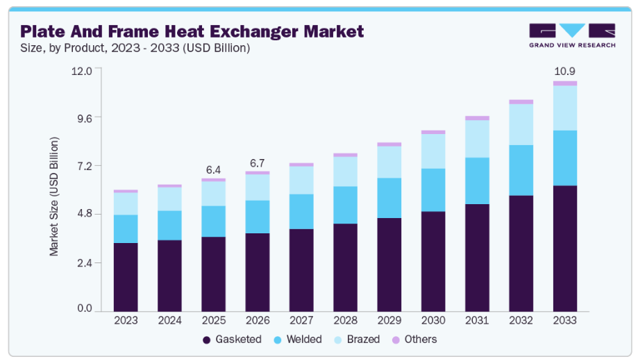 従来型のシェル・アンド・チューブ式熱交換器と比較して、コンパクトな設計、高い熱伝達効率、および低いメンテナンスコストを特徴とするため、産業ではこれらのシステムの採用がますます進んでいます。もう一つの主要な推進要因は、再生可能エネルギーおよび廃水処理用途におけるプレート・アンド・フレーム式熱交換器の利用拡大です。持続可能な技術への注目が高まっていることに加え、グリーンエネルギーを支援する政府規制も相まって、地熱、バイオマス、地域暖房システムにおけるこれらの熱交換器の利用が促進されています。さらに、先進国および新興経済圏の両方において、清潔な水への需要の高まりや効率的な廃水の再利用が市場成長を後押ししており、これらの熱交換器は現代の産業インフラにおける重要な構成要素としての地位を確立しています。