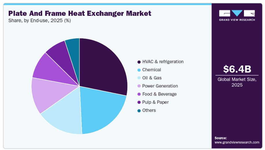 HVACおよび冷凍セクターは、プレート・フレーム式熱交換器市場を牽引しており、2025年には28.2%のシェアを占めました。これは、商業、家庭用、および産業分野において、効率的な冷暖房システムへの需要が広範に存在するためです。これらの熱交換器は、エネルギー効率の向上、運用コストの削減、および室内気候制御の維持において極めて重要な役割を果たしています。急速な都市化とスマートビルディング技術の台頭が、導入をさらに後押ししています。快適性向上のための冷房およびプロセス用冷凍の両方において重要な役割を果たしていることが、その市場シェアの首位を確固たるものにしています。