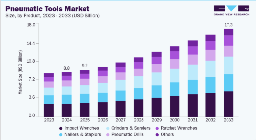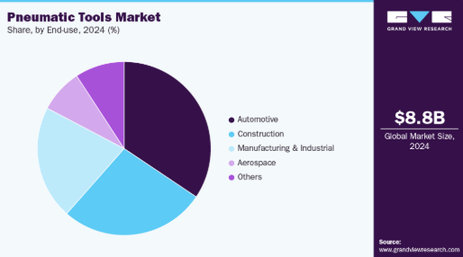 需要を牽引する主な要因には、軽量かつ省エネルギーな工具の普及拡大、自動車アフターマーケットの成長、コンプレッサーおよびエア管理システムの継続的な技術改良が含まれる。空気圧工具は電動工具と比較して、高速化、メンテナンス削減、長寿命化といった運用上の利点を提供する。持続可能なソリューションを求める産業は、低エネルギー消費と排出量の少なさから空気圧システムに目を向けている。さらに、製造拠点の急速な拡大と金属加工・製造活動における精密性への需要増大が、世界市場における主要な需要加速要因となっている。