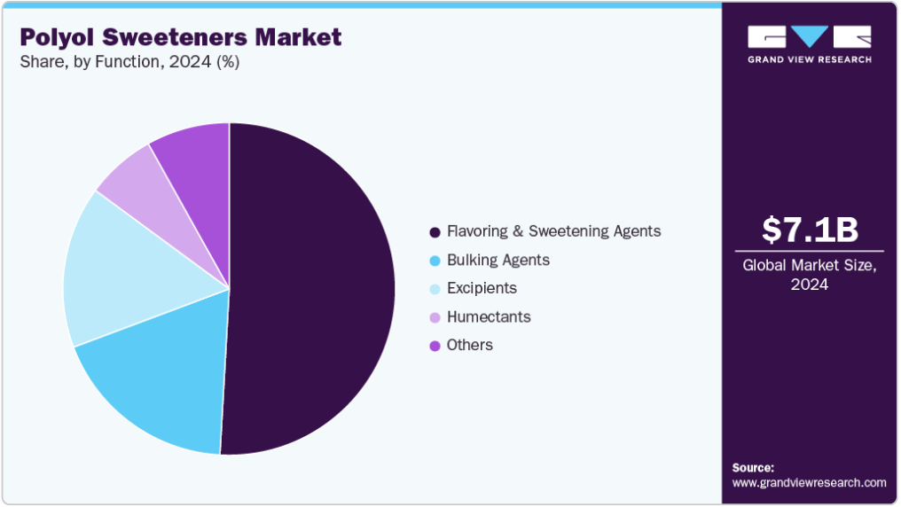 2024年には、香料・甘味料セグメントが市場を支配し、収益シェアの50.9%を占めました。各ポリオールの甘味は異なり、使用される製品内の他の成分の影響を受けることがよくあります。さらに、ポリオール甘味料においては、口当たりや風味を支える特性が重要です。ポリオールは、アスパルテーム、サッカリン、アセスルファムカリウム、ネオテーム、スクラロース、ステビア甘味料などの低カロリーまたは高強度甘味料と組み合わせて、無糖菓子製品を製造することが多い。ポリオールが従来品の砂糖と同様の穏やかな甘味と体積・食感を付与する能力は、今後数年間で食品・飲料業界における製品需要を促進する可能性が高い。
