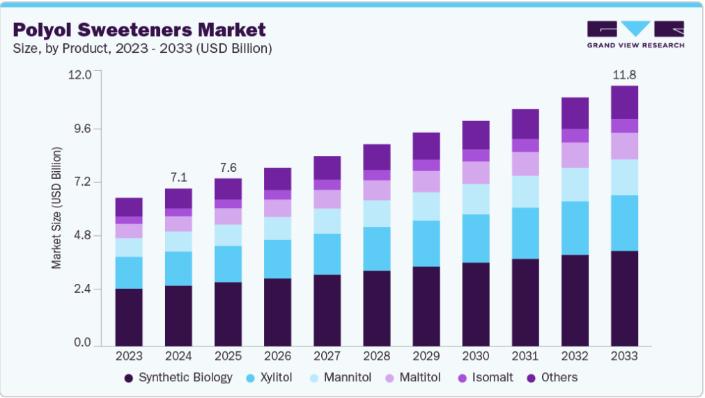 食品・飲料業界における糖代替品への需要増加と、健康全般に対する消費者意識の高まりが市場の牽引要因となる見込みです。ポリオール系甘味料は、樺の樹皮、トウモロコシの芯、パルプ・紙廃棄物などのバイオ廃棄物から炭水化物を発酵または水素化して得られる糖類誘導体である。