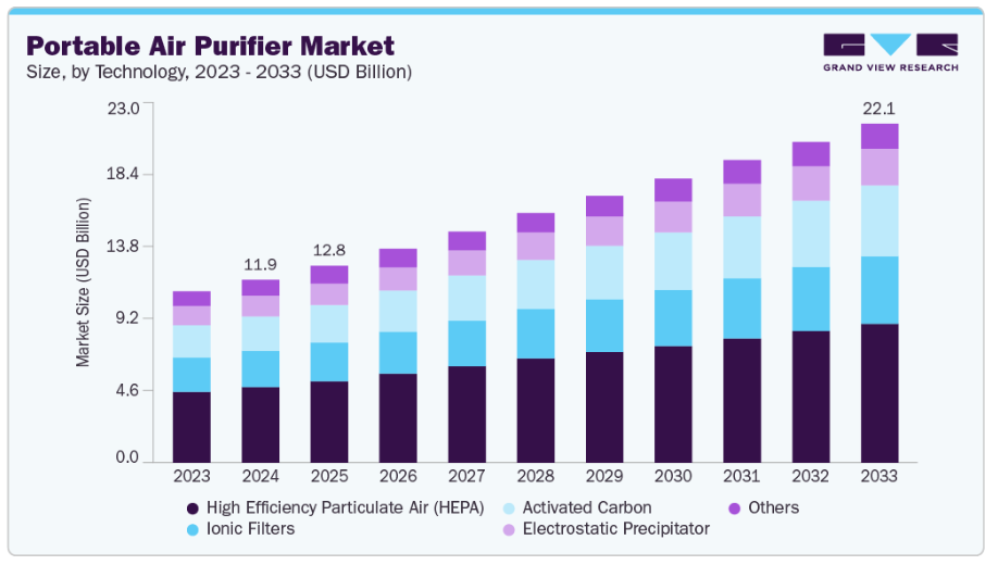 ■ 英語タイトル:Portable Air Purifier Market Size, Share & Trends Analysis Report By Technology (High Efficiency Particulate Air, Activated Carbon, Ionic Filters), By Sales Channel (Online, Offline), By Coverage Range (Below 200 Sq. Ft., 200-250 Sq. Ft.), By Application, By Region, And Segment Forecasts, 2025 - 2033