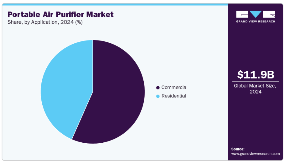 業務用セグメントはポータブル空気清浄機市場を牽引しており、2024年には56.6%のシェアを占めました。これは、オフィス、病院、ホテル、教育機関などにおける清潔な室内環境への需要増加によるものです。企業は従業員の健康確保と室内空気質基準の達成に向け、空気清浄システムへの投資を拡大しています。パンデミック後の衛生・空気安全への重視が、公共・商業空間における設置をさらに促進しました。加えて、スマート監視システムを備えた大容量・低騒音型清浄機の技術進歩が、本分野での普及を支えています。