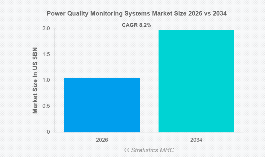 Stratistics MRCによると、世界の電力品質監視システム市場は2026年に10億5,000万ドル規模となり、予測期間中に年平均成長率(CAGR)8.2%で成長し、2034年までに19億7,000万ドルに達すると見込まれています。