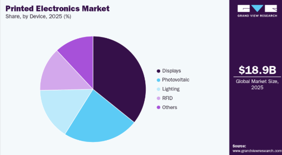 2025年、ディスプレイ分野はプリントエレクトロニクス市場において最大のシェアを占めました。この優位性は、優れた曲げやすさとエネルギー効率を兼ね備えた、コスト効率が高くカスタマイズ可能なパネルを製造できる同技術の能力に起因しており、折りたたみ式スマートフォンや曲面車両用ディスプレイといった革新的な製品に対する高まる需要に応えています。例えば、2025年5月、サムスンディスプレイは米国で開催された「Display Week」において、先進的なディスプレイの研究開発分野を紹介し、EL-QDおよびOLEDoSのプロトタイプ、センサー統合型OLED技術、そして革新的なフォームファクターを披露しました。これにより、次世代のプリンテッドエレクトロニクスおよびフレキシブルエレクトロニクス分野におけるリーダーシップを確立しました。