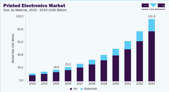 これは、2026年から2033年にかけて年平均成長率(CAGR)23.5%で成長することになります。各産業が、民生用電子機器、自動車、ヘルスケア、スマートパッケージングなどの用途向けに、コスト効率に優れ、軽量かつ柔軟な電子部品を採用するにつれ、市場は拡大しています。