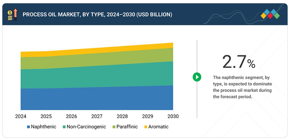 タイヤ製造業界やポリマー加工業界の継続的な拡大に伴い、材料化合物の製造および性能向上にプロセスオイルが必要とされることから、プロセスオイル製造分野の需要は時間とともに着実に増加しています。これらの産業の成長に加え、成長を続け、コンプライアンス対応または安全グレードのオイルを必要とする産業も、様々な用途における需要を今後も牽引し続けるでしょう。