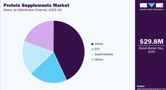 オンラインセグメントは2025年に43.0%という最大の収益シェアで市場をリードしました。オンライン流通経路を通じたプロテインサプリメントの販売は、今後数年間で最も高い成長が見込まれています。インターネットユーザーの増加、多数のブランドへの容易なアクセス、消費者の忙しいライフスタイル、24時間365日の製品入手可能性、ショッピングの利便性、そして幅広い製品ラインナップが、オンライン流通経路を通じたプロテインサプリメント販売を牽引する要因です。