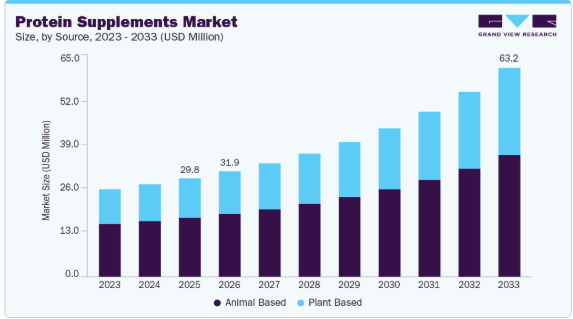 2025年時点で動物性タンパク質サプリメントセグメントが59.9%の最大収益シェアを占め市場を牽引。ホエイ、カゼイン、コラーゲン、卵が主要な動物性タンパク源である。栄養面での多大な利点から、今後数年間で動物性タンパク質サプリメントの需要は大幅な成長が見込まれる。動物性原料はタンパク質濃度が高く、サプリメント製造に好まれる。