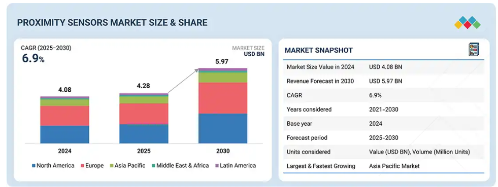 近接センサー市場は、2025年の42億8,000万米ドルから2030年までに59億7,000万米ドルに達すると予測されており、予測期間中の年平均成長率(CAGR)は6.9%と見込まれています。近接センサーは、物理的な接触なしに近接する物体の存在または不在を検知する非接触型デバイスであり、電磁界や赤外線ビームを用いて動作することが一般的です。これらのセンサーは、効率性と安全性の向上を目的として、産業オートメーション、自動車、民生用電子の分野で広く活用されています。