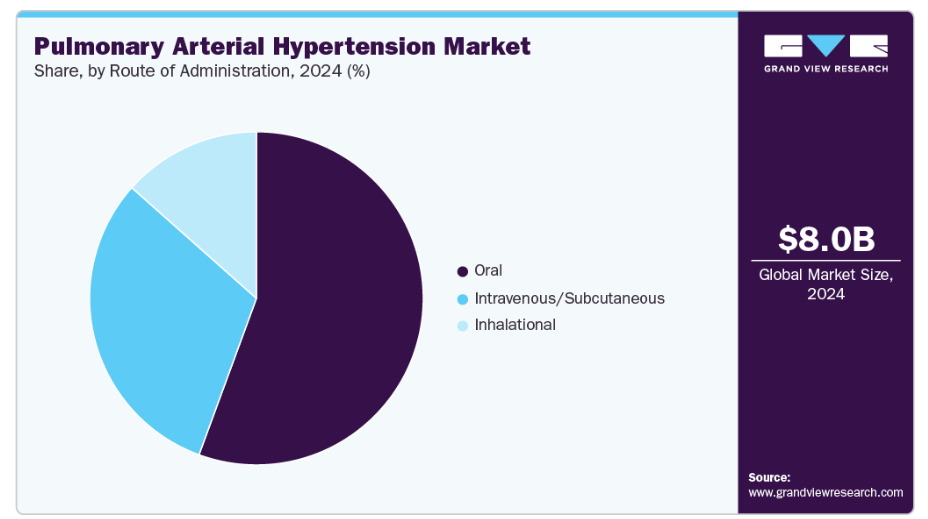 - 投与経路別では、経口投与セグメントが2024年に55.59%の収益シェアでPAH市場を支配しました。