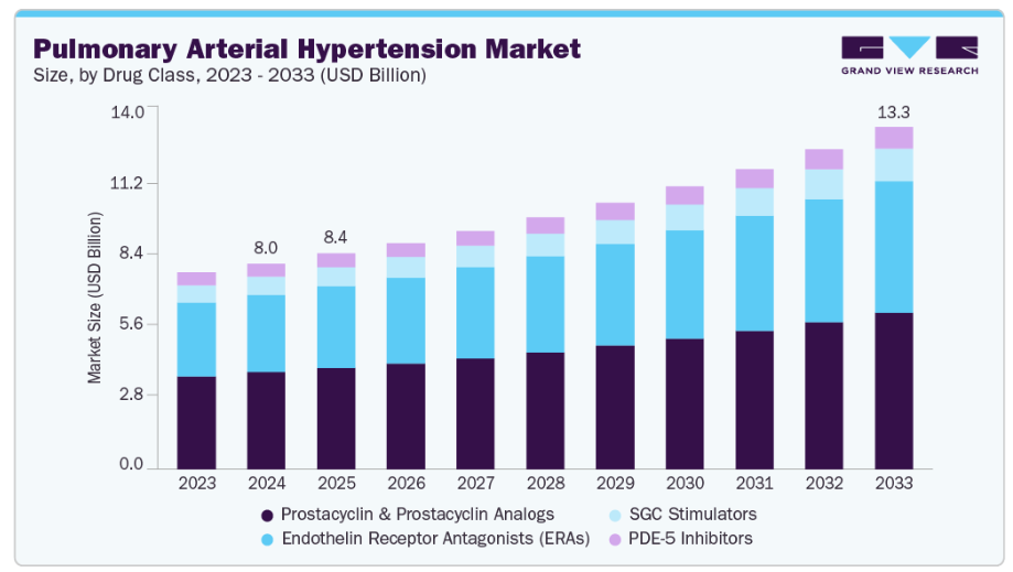 2021年に発売されたレミュニティポンプのような新興技術は、皮下投与によるトレプロスチニル提供を実現し、薬剤送達に革命をもたらしています。ウェアラブル機器を含むデジタルヘルスツールはリアルタイムモニタリングを可能にし、PAH管理の個別化を促進します。こうした進歩と強力な研究開発パイプラインが相まって、治療パラダイムの再構築と2033年までの市場成長の持続が期待されます。