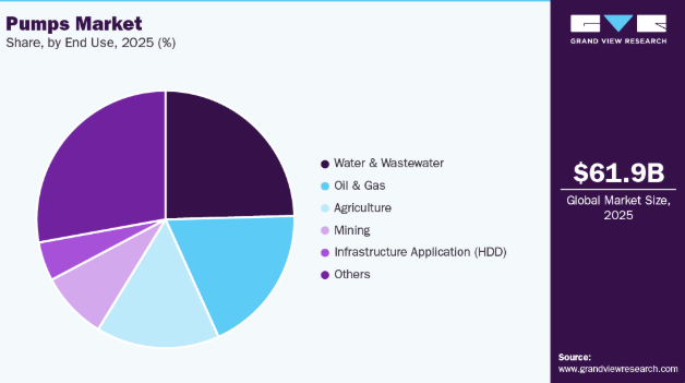 石油・ガス部門セグメントは、2026年から2033年にかけて収益ベースで5.4%という高いCAGRで成長すると予測される。水・廃水処理は、世界的な水不足と汚染への懸念の高まりから、2025年に24.6%のシェアを占め、ポンプの主要な最終用途として君臨し続けている。政府主導の施策とインフラ整備が、処理施設におけるポンプ設置を促進している。都市拡大と産業排水は効率的な水管理ソリューションを必要とする。エネルギー効率に優れた自動化ポンプへの需要が、このセグメントの成長を牽引している。