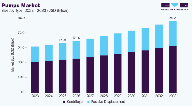 容積式ポンプセグメントの需要は、2026年から2033年にかけて収益ベースで5.3%という最速のCAGRで成長すると予測される。遠心ポンプは、シンプルな設計、低メンテナンス性、高流量処理能力により最大の市場を占め、2025年には66.5%のシェアを占めた。これらは給水システム、HVACシステム、産業用途で広く使用されている。連続運転における効率性の高さから、大規模システムに最適です。自治体やインフラプロジェクトからの需要増加が、その優位性を継続的に支えています。