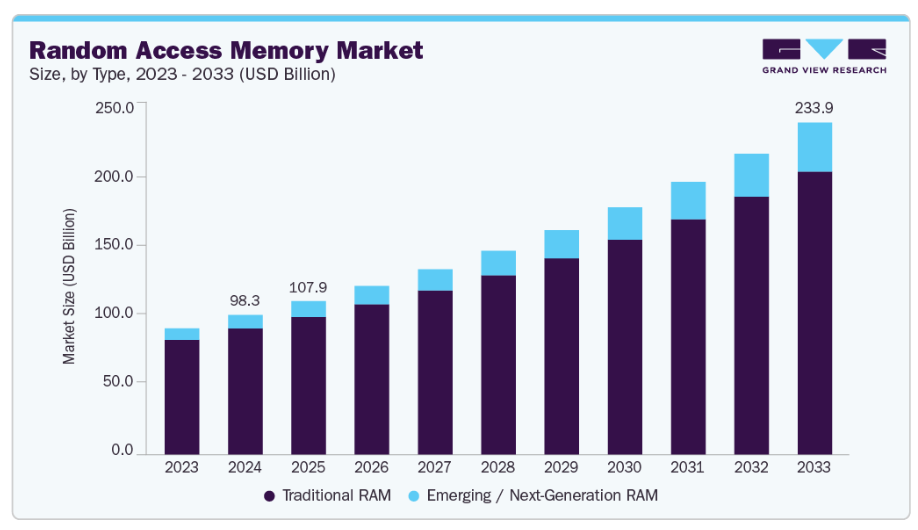 ■ 英語タイトル:Random Access Memory Market Size, Share & Trend Analysis Report By Type (Traditional RAM, Next-Generation RAM), By End Use (Computing Devices, Consumer Electronics, Data Centers & HPC), By Region, And Segment Forecasts, 2025 - 2033
