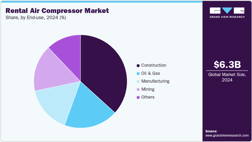 建設セグメントは、移動式で信頼性の高い圧縮空気ソリューションへの恒常的な需要により、2024年にレンタル空気圧縮機市場を牽引し、収益シェアの37.1%を占めました。空気圧縮機は、工具の動力源、現場準備、インフラ開発に不可欠です。購入よりもレンタルを好む傾向は、一時的な設備への資本支出削減に寄与します。頻繁なプロジェクト開始、変動する期間、遠隔地での作業が、建設会社にとってレンタルを理想的な選択肢としています。