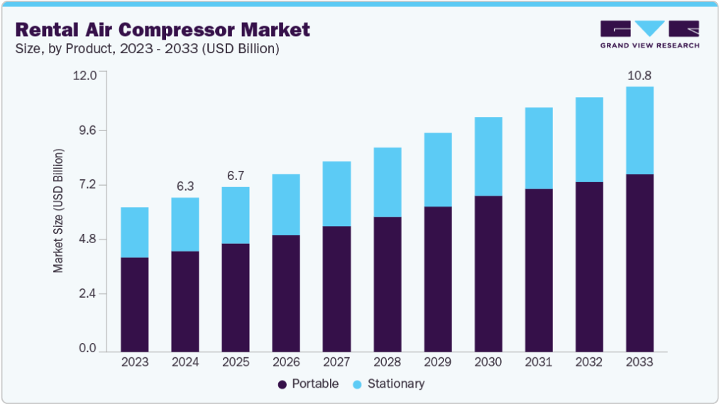 長期レンタルセグメントは、2025年から2033年にかけて、収益ベースで6.0%という大幅なCAGRで成長すると予想されています。長期レンタルは、製造や石油・ガスなどプロジェクト期間が長期化する産業からの需要増加により著しく成長している。これらの契約は、数ヶ月にわたる継続的な空気供給を必要とするユーザーに安定性とダウンタイムの削減を提供する。顧客は、複数の短期契約と比較して、より低い料金と少ない管理負担の恩恵を受ける。業務効率化のための機器アウトソーシングへの傾向がこの成長を支えている。