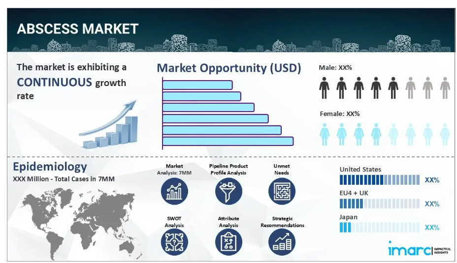 IMARC Groupの新報告書は、米国、EU4(ドイツ、スペイン、イタリア、フランス)、英国、日本における膿瘍市場について包括的な分析を提供しております。これには、治療実践、市場流通中および開発中の薬剤、個別療法のシェア、7大市場における市場動向、主要企業とその薬剤の市場実績などが含まれます。また、7大市場における現在および将来の患者数についても記載されております。本報告書によれば、米国は膿瘍患者数が最も多く、治療市場規模も最大となっています。さらに、現在の治療実践/アルゴリズム、市場推進要因、課題、機会、償還シナリオ、未充足医療ニーズなども本報告書に記載されております。本報告書は、製造業者、投資家、ビジネス戦略家、研究者、コンサルタント、ならびに膿瘍市場に関与する、あるいは参入を計画されている全ての方にとって必読の資料です。