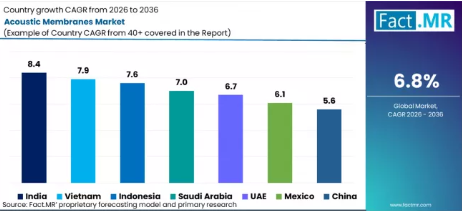 - インド:インドにおける音響膜の需要は、2036年まで年平均成長率(CAGR)8.4%で増加すると予測されています。急速な都市化とインフラ開発に加え、商業空間における防音ソリューションへのニーズの高まりが、市場の拡大を牽引し続けています。