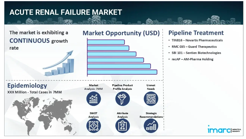 IMARC Groupの新報告書は、米国、EU4(ドイツ、スペイン、イタリア、フランス)、英国、日本における急性腎不全市場を網羅的に分析しています。これには、治療実践、市場流通中および開発中の薬剤、個別療法のシェア、7大市場における市場動向、主要企業とその薬剤の市場実績などが含まれます。本レポートではさらに、7大市場における現在および将来の患者数についても提示しています。レポートによれば、米国は急性腎不全の患者数が最も多く、その治療市場としても最大規模を占めています。さらに、現在の治療実践/アルゴリズム、市場推進要因、課題、機会、償還シナリオ、未充足医療ニーズなども本報告書に記載されております。本報告書は、メーカー、投資家、ビジネス戦略家、研究者、コンサルタント、および急性腎不全市場に関与している、あるいは参入を計画している全ての方にとって必読の資料です。