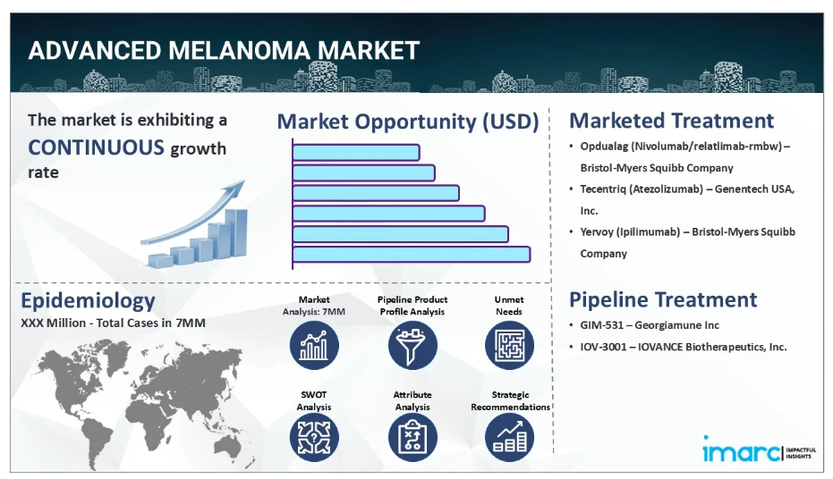 IMARC Groupの新報告書は、米国、EU4(ドイツ、スペイン、イタリア、フランス)、英国、日本における進行性黒色腫市場について包括的な分析を提供しております。これには、治療実践、市場流通中および開発中の薬剤、個別療法のシェア、7大市場における市場動向、主要企業とその薬剤の市場実績などが含まれます。本報告書では、7大市場における現在および将来の患者層についても提示しております。本報告書によれば、米国は進行性黒色腫の患者数が最も多く、治療市場としても最大規模を占めています。さらに、現在の治療実践/アルゴリズム、市場推進要因、課題、機会、償還状況、未充足医療ニーズなども本報告書で提供されています。本レポートは、メーカー、投資家、ビジネス戦略家、研究者、コンサルタント、および進行性黒色腫市場に関与している、あるいは参入を計画している全ての方にとって必読の資料です。
