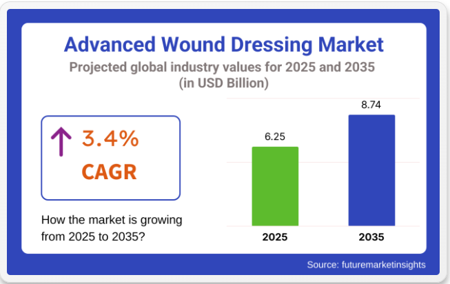 世界の先進創傷被覆材市場は、2025年に約62億5000万米ドルと推定され、予測期間中に年平均成長率(CAGR)3.4%で成長し、2035年までに約87億4000万米ドルに達すると予測されています。市場拡大は、糖尿病性足潰瘍、静脈性下腿潰瘍、褥瘡などの慢性創傷の有病率上昇によって牽引されると予想される。