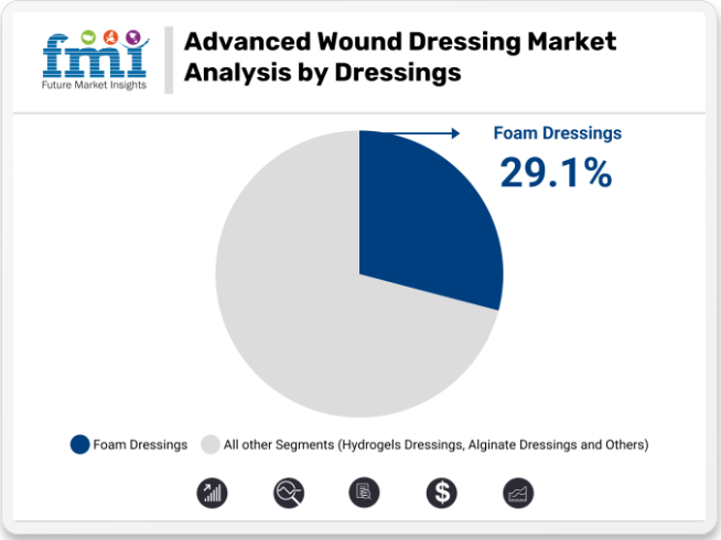 2025年、フォームドレッシングは先進創傷被覆材市場全体の収益の29.1%を占めると予測される。その優位性は、創傷治癒に不可欠な最適な湿潤環境を維持しつつ、創傷滲出液を効果的に管理する能力に起因する。