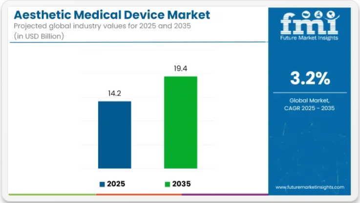 世界の美容医療機器市場は大幅な成長が見込まれており、2025年の推定市場規模は141億7,000万米ドル、2035年までに194億2,000万米ドルに達すると予測され、年平均成長率(CAGR)は3.2%となる見込みです。この成長は、非侵襲的および低侵襲的な美容治療に対する消費者需要の高まりと、医療技術の進歩によって牽引されている。