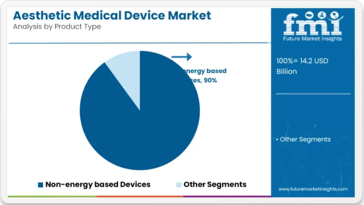 製品種別では、美容医療機器市場はエネルギーベース美容機器、レーザー補助脂肪吸引機器、レーザー皮膚再生機器、非エネルギーベース美容機器などに二分される。非エネルギーベース機器セグメントは89.99%の市場価値を占めると予測される。
