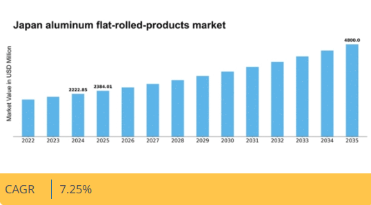 日本のアルミニウム平鋼板市場は、自動車・建設分野での需要増加を背景に、2024年から2035年にかけて年平均成長率(CAGR)7.25%で拡大すると予測される。