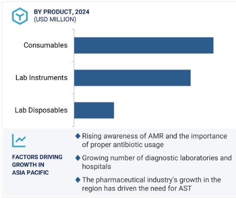 アジア太平洋地域は、世界の抗菌薬感受性試験市場において重要なプレーヤーとして台頭しており、CAGRが最も高くなっています。同地域では、所得の向上と医療施設へのアクセスの改善により人口が増加しており、その結果、診断サービスの需要が増加しています。実際、抗生物質耐性病原体の増加による感染症の増加により、適切な治療の指針となる正確なASTが非常に重要になっています。さらに、ASTの技術は、迅速な分子診断や自動化システムによって進歩し、より効率的で所要時間が短縮されるようになりました。