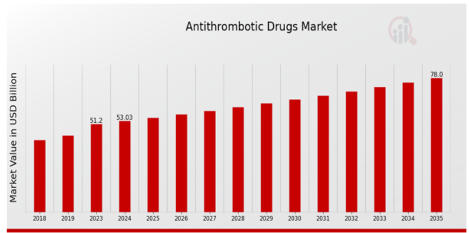 MRFRの分析によると、抗血栓薬の市場規模は2023年に51.2 (USD Billion)と推定されました。抗血栓薬市場は、2024年の530億3,000万ドル(USD Billion)から2035年には780億ドル(USD Billion)に成長する見込みです。予測期間中(2025年〜2035年)の抗血栓薬市場のCAGR(成長率)は約3.57%と予測されます。