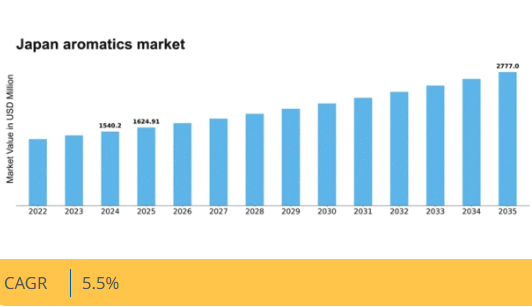 日本の芳香族市場は、様々な産業用途における需要増加と持続可能な取り組みを背景に、2024年から2035年にかけて年平均成長率(CAGR)5.5%で成長すると予測されています。