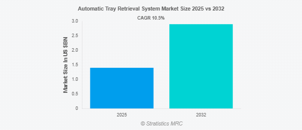 Stratistics MRCによると、自動トレイ回収システムの世界市場は2025年に14億ドルを占め、予測期間中の年平均成長率は10.5%で、2032年には29億ドルに達する見込みです。自動トレイ回収システム(ATRS)は、空港、病院、産業環境で一般的に使用されているインテリジェントなマテリアルハンドリングソリューションです。ATRSは、使用後のトレイの返却と積み重ねのプロセスを自動化し、作業効率と衛生を向上させます。空港のセキュリティでは、ATRSはトレイ管理プロセスを合理化することで、乗客の待ち時間を短縮し、処理能力を向上させます。このシステムはセンサー、コンベア、ロボットアームを使用しており、人件費の節約と利用者の利便性向上に貢献しています。