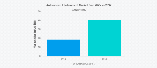 Stratistics MRCによると、世界の自動車インフォテインメント市場は2025年に186億ドルを占め、予測期間中の年平均成長率は11.9%で、2032年には409億ドルに達する見込みです。自動車インフォテインメントとは、ドライバーや同乗者にエンターテインメント、情報、コネクティビティ機能の組み合わせを提供する統合型車載システムのことです。これらのシステムには通常、タッチスクリーン、オーディオおよびビデオ再生、GPSナビゲーション、スマートフォン統合(Apple CarPlayやAndroid Autoなど)、音声コントロール、インターネットアクセスが含まれます。運転体験を向上させるように設計された自動車用インフォテインメント・システムは、リアルタイムの交通情報、ハンズフリー通信、さまざまなアプリへのアクセスも提供します。最近の自動車は、これらのシステムを気候、メディア、車両設定を制御する中心的なハブとして使用することが多く、直感的なインターフェースと外部のデジタル・エコシステムとの高度な接続性により、利便性と安全性の両方を促進しています。