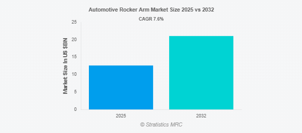 Stratistics MRCによると、自動車用ロッカーアームの世界市場は2025年に126.1億ドルを占め、予測期間中の年平均成長率は7.6%で、2032年には210.6億ドルに達する見込みです。自動車用ロッカーアームは、自動車の内燃機関における重要な部品です。エンジンのバルブが最適なタイミングで開閉し、エンジン性能を最適化するために、カムシャフトとバルブを機械的に連結する役割を果たします。カムシャフトが回転すると、カムローブがロッカーアームを押し上げ、バルブを強制的に開きます。ロッカーアームは通常、スチールやアルミニウムのような高強度材料で作られており、エンジン作動時の繰り返しのひずみに耐えるように設計されています。