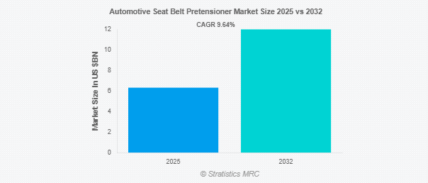 Stratistics MRCによると、自動車用シートベルトプリテンショナーの世界市場は2025年に63億2000万ドルを占め、予測期間中の年平均成長率は9.64%で、2032年には120億ドルに達する見込みです。自動車用シートベルト・プリテンショナーは、衝突時の乗員保護を強化するために最新の自動車シートベルト・システムに組み込まれた重要な安全装置です。シートベルトやエアバッグと連動し、傷害のリスクを最小限に抑えます。急激な衝撃や急減速をセンサーが感知すると、プリテンショナーが作動し、シートベルトを瞬時に巻き取ってたるみをなくし、乗員をシートにしっかりと固定します。この急激な締め付けが前方への動きを抑え、乗員がエアバッグの展開に最適な姿勢を維持できるようサポートします。プリテンショナーは拘束効果を向上させることで、乗員の安全と衝突傷害の軽減に大きく貢献します。