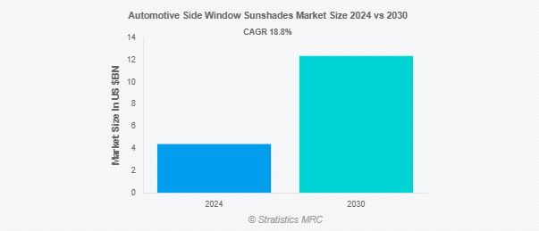 Stratistics MRCによると、自動車用サイドウィンドウサンシェードの世界市場は2024年に44億ドルを占め、予測期間中の年平均成長率は18.8%で、2030年には123.6億ドルに達する見込みです。自動車のサイドウィンドウサンシェードは、乗客の快適性を向上させ、車内を保護するために作られた必要なアドオンです。サンシェードの製造には、メッシュや反射テキスタイルなどの高品質素材が一般的に使用され、有害な紫外線を効率的に遮断し、車内の熱蓄積を軽減します。日差しのまぶしさを軽減し、特に長時間の移動や暑い気候でのドライブをより安全で楽しいものにします。自動車用サイドウィンドウ・サンシェードは、取り付けや取り外しが簡単で、開閉式、マグネット式、クリップ式など、さまざまなデザインがあります。