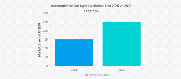 Stratistics MRCによると、自動車用ホイールスピンドルの世界市場は2025年に1,520億ドルを占め、予測期間中の年平均成長率は7.5%で、2032年には2,521億ドルに達する見込みです。自動車用ホイールスピンドルは、自動車のサスペンションとステアリングシステムの主要部品で、車輪の回転と安定性をサポートします。一般的に高強度鋼製で、ホイールハブとサスペンションを接続し、スムーズなハンドリングを実現します。スピンドルはベアリングと一体化し、摩擦を最小限に抑え、動きを最適化します。耐久性に優れた設計で、大きな荷重や衝撃に耐えます。安全性と性能に不可欠な適切なホイールアライメントは、その精度にかかっています。定期的な点検は、ステアリングやタイヤの寿命に影響する摩耗や故障を防ぎます。損傷やミスアライメントがあれば、ハンドリングの問題につながる可能性があり、自動車工学において不可欠な要素となっています。