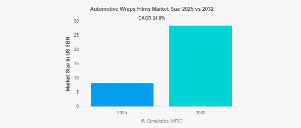 Stratistics MRCによると、自動車用ラップフィルムの世界市場は2025年に82.4億ドルを占め、予測期間中の年平均成長率は24.8%で、2032年には284.3億ドルに達する見込みです。自動車用ラップフィルムは、美観、保護、ブランディングの目的で自動車の外装を覆うために使用される、粘着性のある薄いビニールシートです。これらのフィルムには、マット、グロス、カーボンファイバー、メタリックなど、さまざまな色、テクスチャ、仕上げがあります。再塗装に代わる費用対効果の高い選択肢を提供し、カスタマイズ、広告、傷や紫外線、天候によるダメージからの表面保護を可能にします。ラップフィルムは耐久性に優れ、取り外し可能で、交換も簡単なため、自動車アフターマーケット業界で人気のある選択肢となっています。