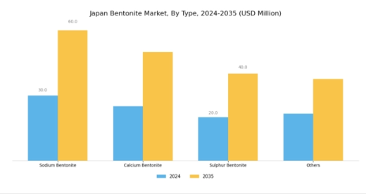 最近では、リチウムイオン電池の製造に使用されるなど、ベントナイトの新規用途の研究が進んでいます。日本がより健康的なエネルギーへの移行や電池技術の強化に努める中、結合剤や充填剤であるベントナイトの需要は増加すると予想されます。さらに、日本は二酸化炭素排出量を最小限に抑えることに尽力しているため、環境目標に合致したベントナイト製品の研究開発への投資が増加しています。さらに、日本の優れたベントナイト製品は輸出の準備も整っているため、国際市場にアクセスする機会もあります。