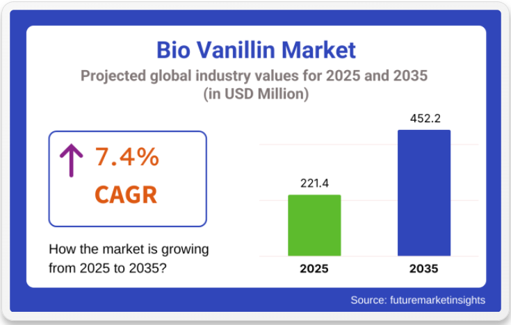 世界のバイオバニリン市場は、予測期間中に年平均成長率(CAGR)7.4%で成長し、2025年の2億2140万米ドルから2035年までに4億5220万米ドルに達すると予測されています。この成長過程は、食品・飲料業界における天然かつ持続可能な原料への消費者需要の高まり、健康意識の向上、そして合成バニリンに代わる環境に優しい代替品としてのバイオバニリンの採用拡大によって牽引されている。
