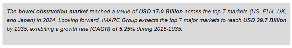 腸閉塞市場は、2024年に主要7市場(アメリカ、EU4、英国、日本)において170億ドルの規模に達しました。