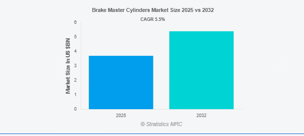 Stratistics MRCによると、ブレーキマスターシリンダーの世界市場は2025年に37億ドルを占め、予測期間中の年平均成長率は5.5%で、2032年には54億ドルに達する見込みです。ブレーキマスターシリンダーは、自動車のブレーキシステムにおいて重要な油圧部品であり、ドライバーがブレーキペダルを踏んで加えた機械的な力を油圧に変換します。この圧力は、ブレーキラインを通じてホイールシリンダーまたはキャリパーに伝達され、車両のブレーキが効率的かつ安全に作動するようにします。通常、アルミニウムや鋳鉄などの耐久性のある金属で作られたマスターシリンダーは、一貫したブレーキ性能と応答性を保証します。最近のシステムは、安全性を高めるために二重回路設計を採用し、ブレーキの完全な故障を防止しています。マスターシリンダーの信頼性と精度は、車両全体の安全性、性能、および規制基準への適合に不可欠です。