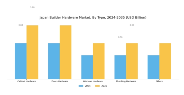 窓金物も同様の傾向を示しており、高性能な窓システムは省エネ対策に貢献します。これは、日本のカーボンフットプリント削減への取り組みの中で主要な関心事となっています。新築・改修に不可欠な配管金物は、効率性と信頼性を確保する現代的な配管システムの需要に支えられ、安定した需要を維持しています。さらに、ビルダーハードウェア市場内のその他の部品は、複雑な建築デザインや特定の機能性に対応するニッチな要求を捉えており、市場における革新と専門化の機会を提供しています。
