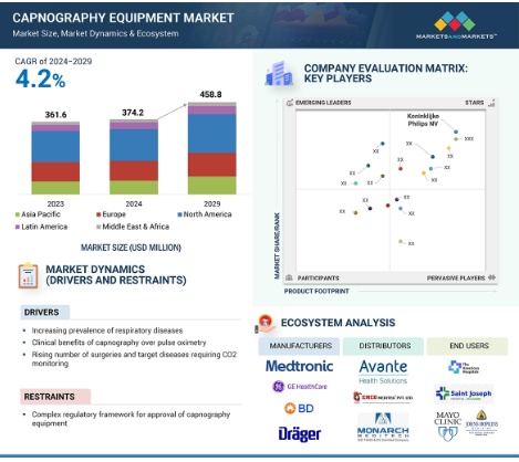 カプノグラフィ装置の世界市場は、2024年の3億7,420万米ドルから2029年には4億5,880万米ドルに達し、年平均成長率4.2%で成長する見込みです。呼吸器疾患の高い有病率や、小型で費用対効果の高い機器を可能にする技術の進歩など、市場を牽引する要因はいくつかあります。さらに、外科手術や重症患者ケアにおける患者の安全性とモニタリングの重視、救急医療サービスや在宅医療環境におけるカプノグラフィの使用拡大が市場成長の原動力となっています。政府の好意的な取り組みと医療への支出の強化が、この傾向をさらに促進しています。