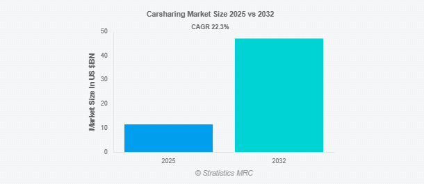 Stratistics MRCによると、世界のカーシェアリング市場は2025年に115億ドルを占め、予測期間中の年平均成長率は22.3%で、2032年には471億ドルに達する見込みです。カーシェアリングは、ユーザーが完全な所有責任を負うことなく、オンデマンドで自動車を利用できる短期車両レンタルモデルです。民間企業やピアツーピア・プラットフォームによって運営され、個人が特定の期間だけ車を借りることができるため、メンテナンス、保険、駐車に関連するコストを削減できます。カーシェアリングは、車両の利用を最適化し、混雑を緩和することで、都市のモビリティ効率を促進します。デジタル・プラットフォームとスマート技術の進歩によりアクセシビリティが向上し、カーシェアリングは企業や個人にとって柔軟で持続可能な交通ソリューションとなっています。