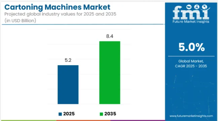 カートニング機械市場は、2025年の52億米ドルから2035年までに84億米ドルへ成長し、予測期間中に5.0%の年平均成長率(CAGR)を記録すると見込まれております。