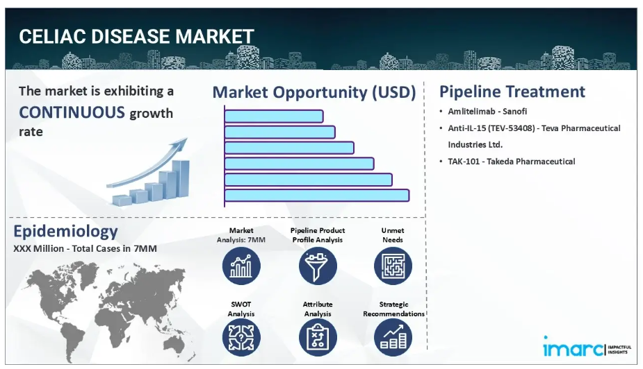 IMARC Groupの新報告書は、米国、EU4(ドイツ、スペイン、イタリア、フランス)、英国、日本におけるセリアック病市場を包括的に分析しております。これには治療実践、市場流通中および開発中の薬剤、個別療法のシェア、主要7市場における市場動向、主要企業とその薬剤の市場実績などが含まれます。また、主要7市場における現在および将来の患者数についても提示しております。本報告書によれば、米国はセリアック病患者数が最も多く、治療市場規模も最大となっています。さらに、現在の治療実践/アルゴリズム、市場推進要因、課題、機会、償還シナリオ、未充足医療ニーズなども本報告書に記載されています。本報告書は、製造業者、投資家、ビジネス戦略家、研究者、コンサルタント、およびセリアック病市場に関与している、あるいは参入を計画している全ての方にとって必読の資料です。