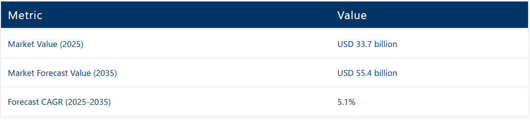 世界の遠心ポンプ市場は、2035年までに554億米ドルに達すると予測されており、予測期間中に217億米ドルの絶対的な増加を記録する見込みです。2025年の市場規模は337億米ドルと評価され、評価期間中は年平均成長率(CAGR)5.1%で上昇する見込み。水処理インフラへの投資増加、エネルギー効率の高いポンプソリューションの採用拡大、世界的なスマート監視技術の展開拡大に支えられ、同期間中に市場規模全体は約1.6倍に成長すると予想される。高い初期投資コストと複雑なメンテナンス要件が市場拡大の障壁となる可能性がある。